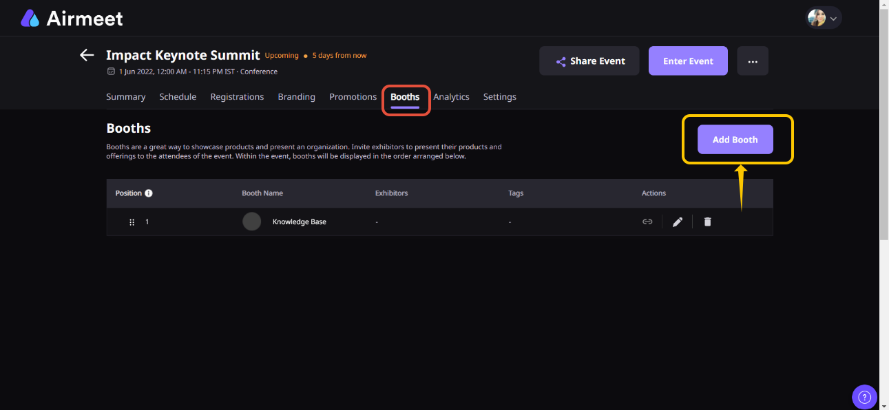 Note: If an exhibitor is added for more than one booth with the same email address, he can access the other booth from any of the links received from Airmeet.