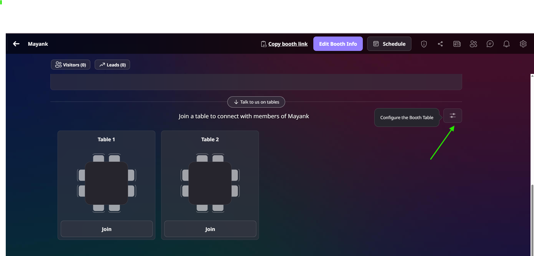 Number of seats : The table will have 8 fixed seats. If the table is full, a seat will be added if an Organizer or Booth Exhibitor tries to join.