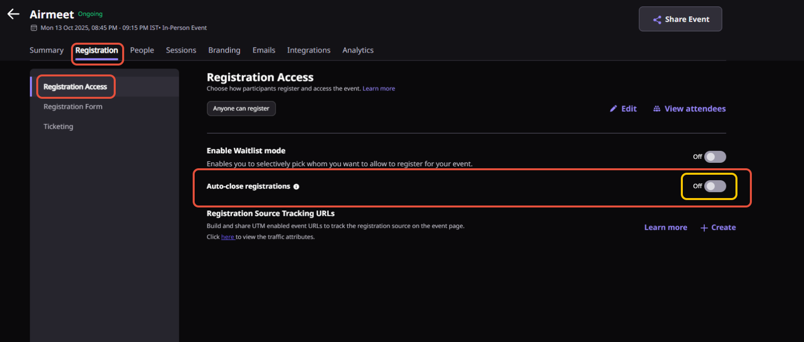 The Auto-close Registrations feature allows organizers to automatically stop new registrations once a set capacity limit is reached.