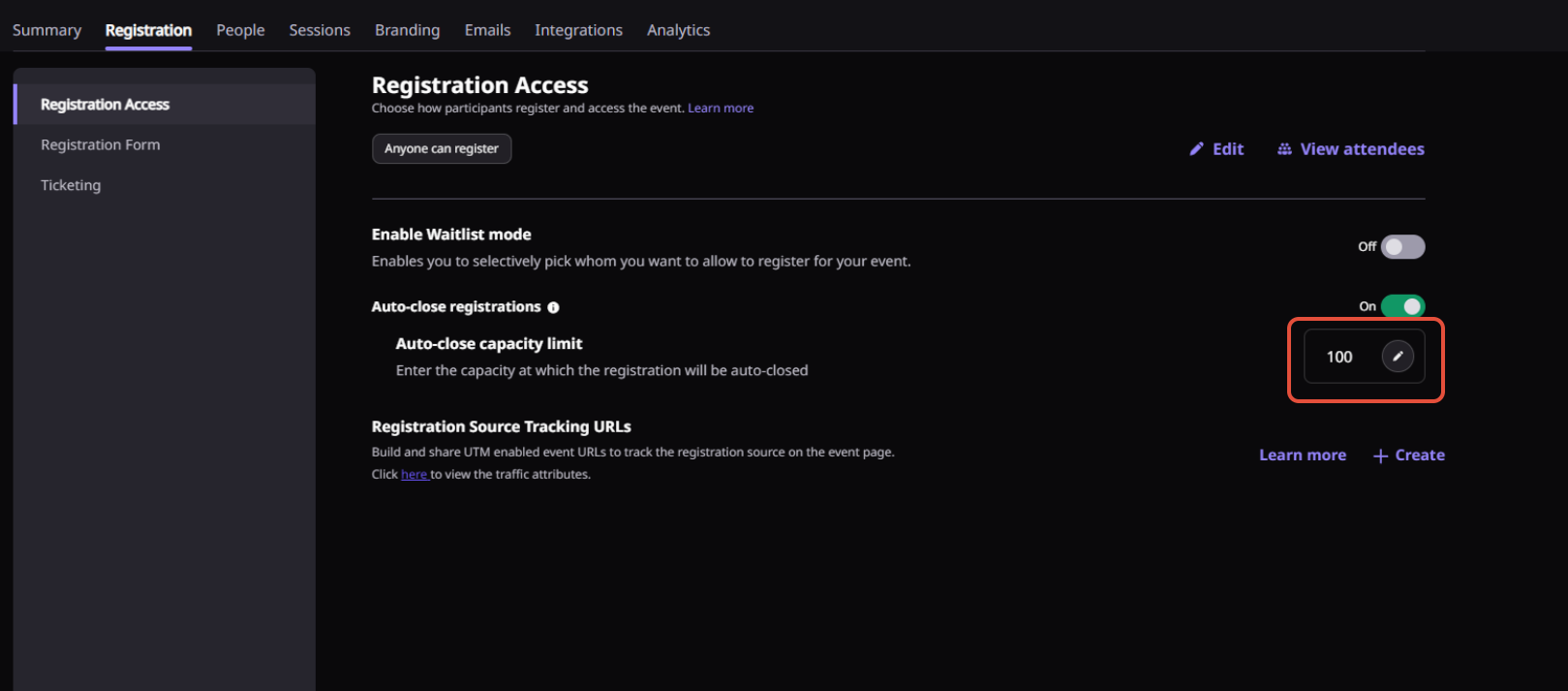 Step 4: Enter the auto-close capacity limit. Specify the maximum number of attendees allowed to register. Once this limit is reached, the registration form will automatically close.