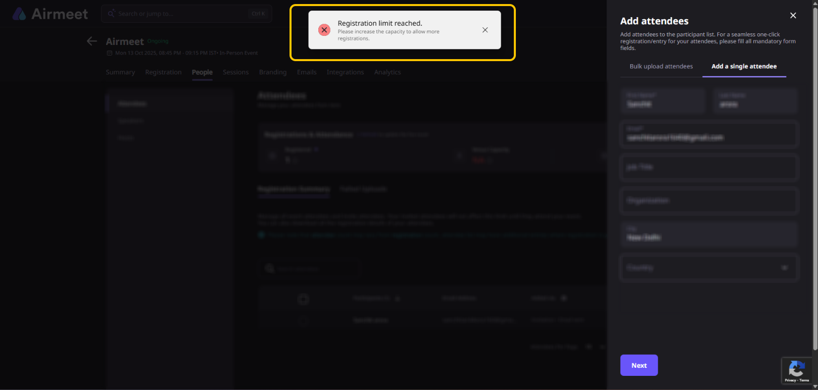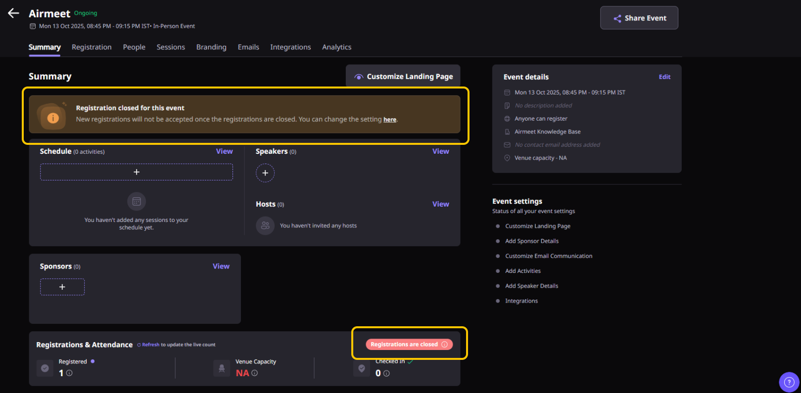 You can set the auto-close limit to 300, and once 300 people register, Airmeet will automatically disable new registrations—saving you from manually monitoring the count.