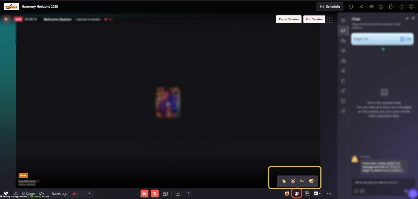 Make your sessions more engaging and interactive with audio reactions. This feature allows speakers, hosts, and co-hosts to play short, expressive sound effects—like claps, drums, horns, or laughs—directly from the live stage.